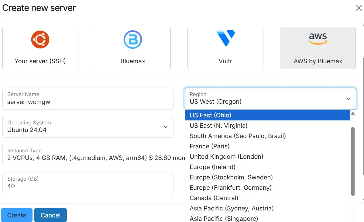 Bluemax Cloud PaaS is powered by AWS EC2 and Vultr servers, giving you full access to every AWS and Vultr data‑center region in the world.